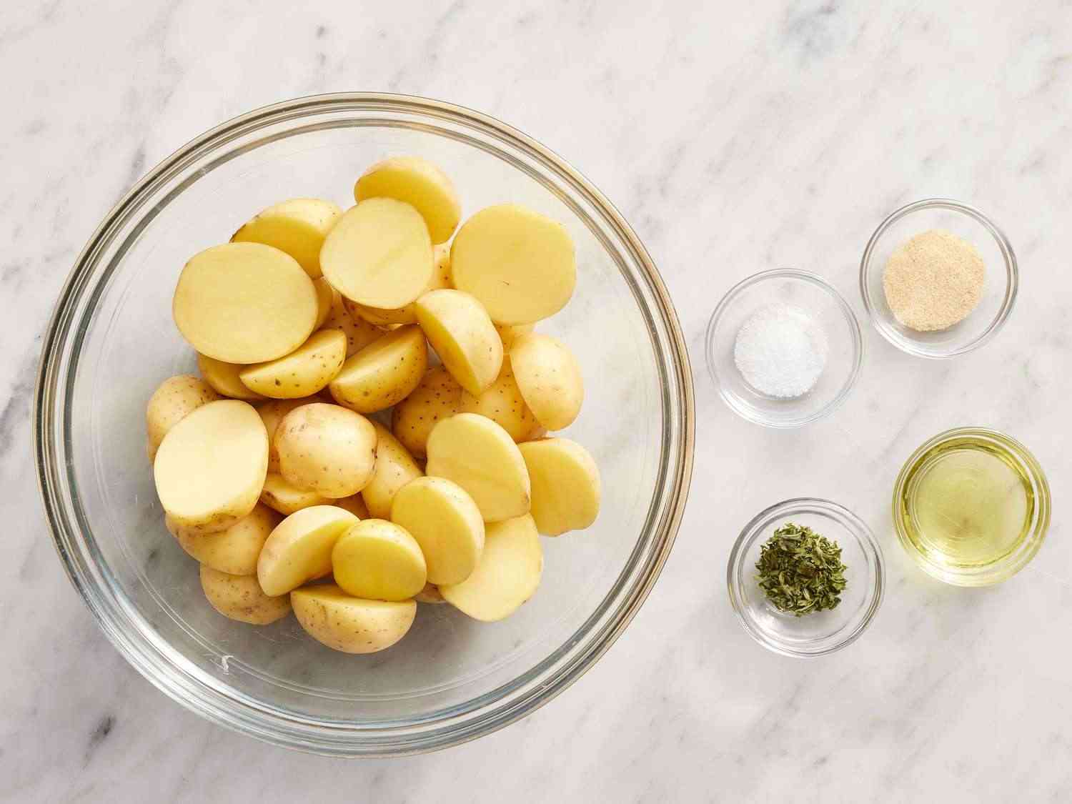 Place potatoes into a bowl; add oil and toss to coat. Add garlic, parsley, and salt; toss until well distributed. Transfer potatoes to the air fryer basket. Dotdash Meredith Food Studios