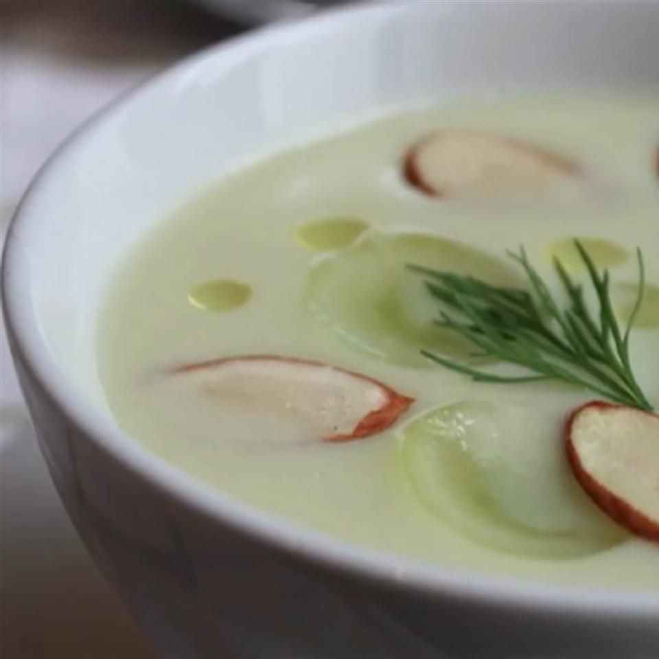 - Step 2:Place cucumbers in a blender with grapes, almonds, 1 tablespoon olive oil, salt, creme fraiche, bread cubes, vinegar, cooled leeks, and water. Puree until smooth, about 1 minute. Strain through a fine mesh sieve. Cover and chill for 1 to 2 hours.